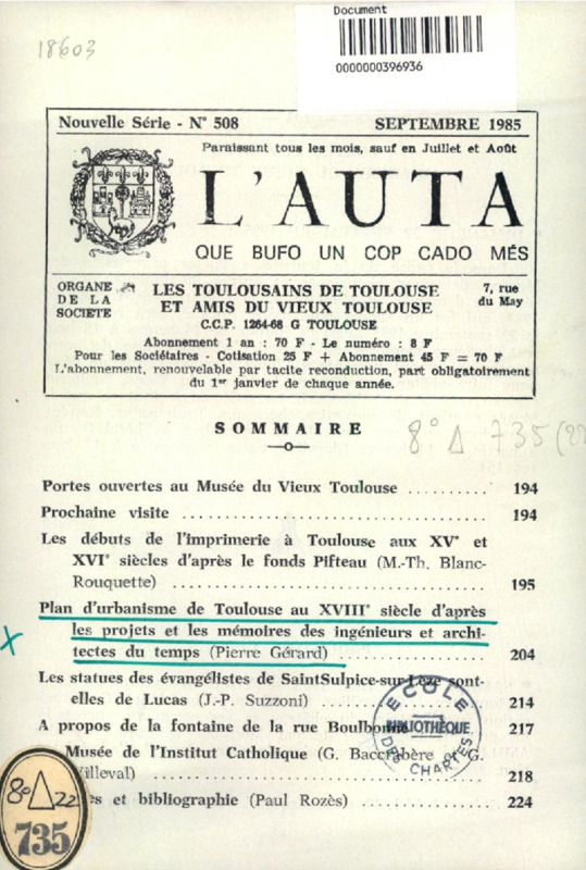 Plan d'urbanisme de Toulouse au XVIIIe siècle d'après les projets et les mémoires des ingénieurs et architectes du temps