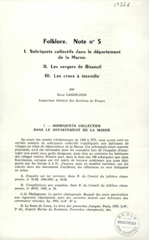 Folklore, note n`5 : I. Sobriquets collectifs dans le département de la Marne, II. Les vergers de Bisseuil, III. Les crocs à incendie