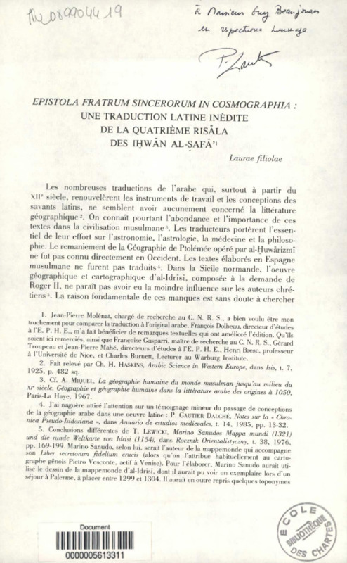 Epistola fratrum sincerorum in Cosmographia : Une traduction latine inédite de la quatrième risāla des IØhwān Al-Ṣafa'