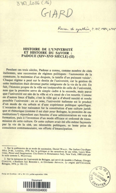 Histoire de l'Université et l'histoire du savoir : Padoue, XIVe-XVIe siècles