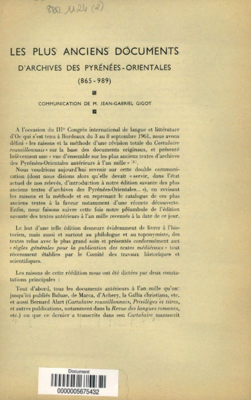 Les plus anciens documents d'archives des Pyrénées-Orientales, 865-989