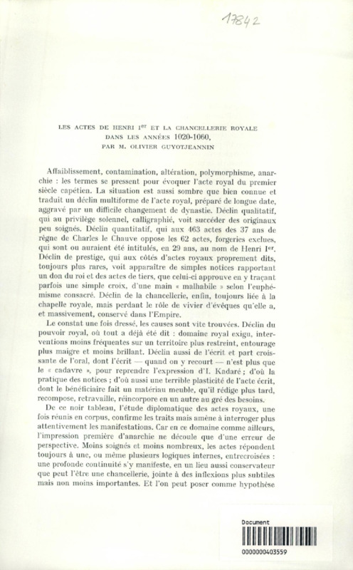 Les actes de Henri Ier et la Chancellerie royale dans les années 1020-1060