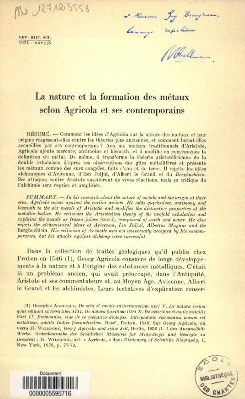 La nature et la formation des métaux selon Agricola et ses contemporains