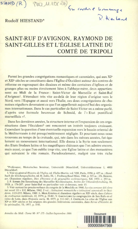 Saint-Ruf d'Avignon, Raymond de Saint-Gilles et l'église latine du comté de Tripoli