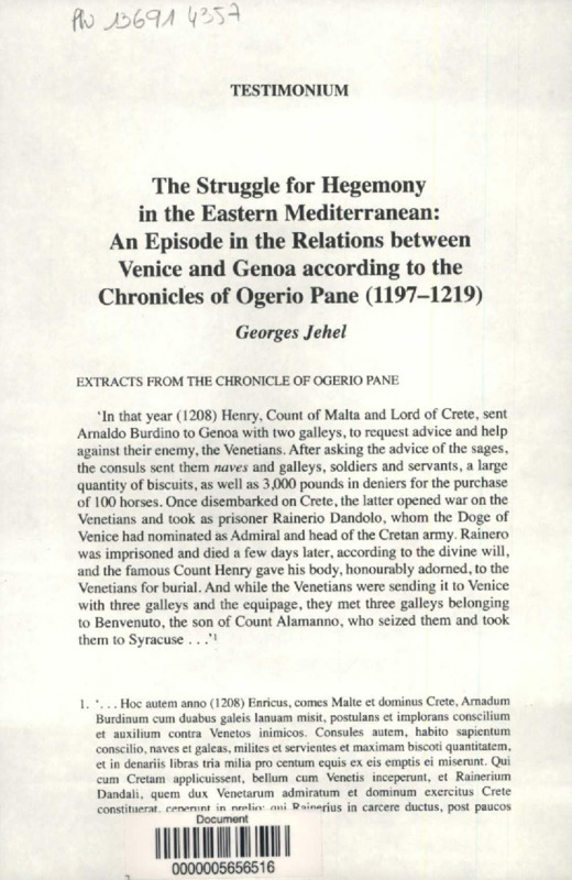 The Struggle for Hegemony in the Eastern Mediterranean : An Episode in the Relations between Venice and Genoa accordind to the Chronicles of Ogerio Pane, 1197-1219