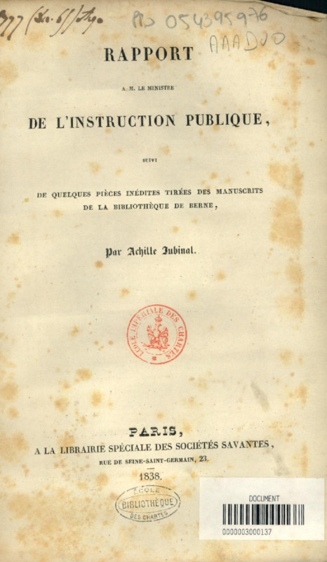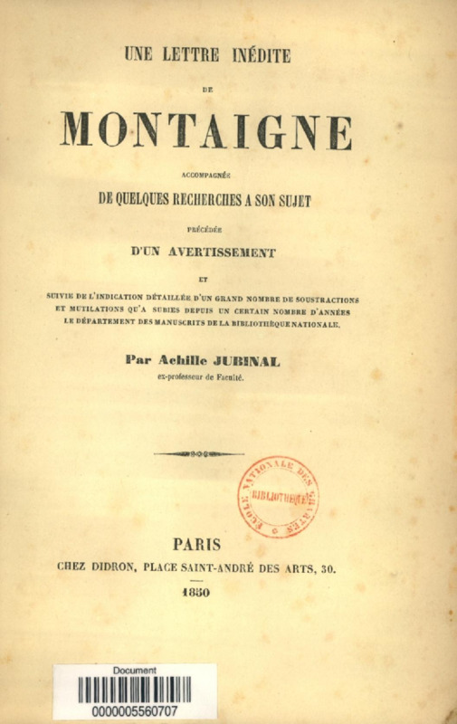 Une Lettre inédite de Montaigne, accompagnée de quelques recherches à son sujet : précédée d'un avertissement et suivie de l'indication détaillée d'un grand nombre de soustractions et mutilations qu'a subies depuis un certain nombre d'années le département des manuscrits de la Bibliothèque nationale