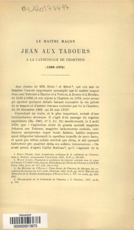 Le maitre maçon Jean aux Tabours, à la cathédrale de Chartres : 1368-1372