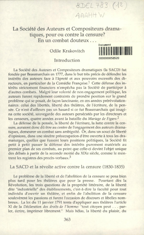 La Société des Auteurs et Compositeurs dramatiques, pour ou contre la censure? En un combat douteux...