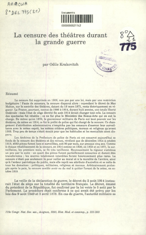 La Censure des théâtres durant la grande guerre