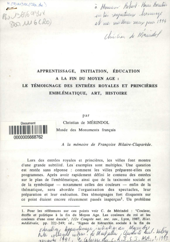 Apprentissage, initiation, éducation à la fin du Moyen âge : Le témoignage des entrées royales et princières, emblématique, art, histoire