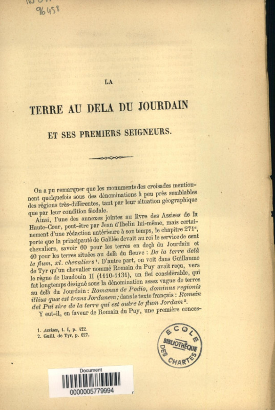 La Terre au delà du Jourdain et ses premiers seigneurs