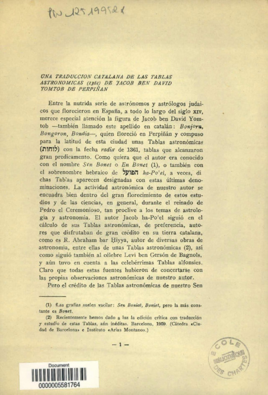 Una traduccion catalana de las tablas astronomicas, 1361, de Jacob Ben David Yomtob de Perpinan