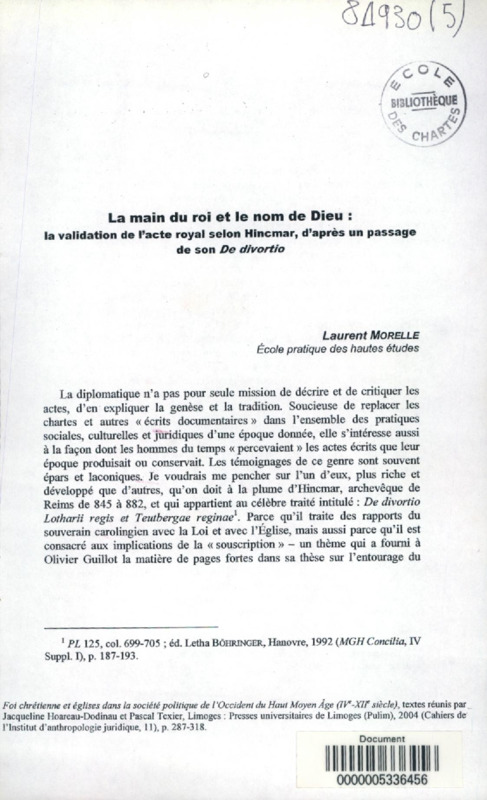 La main du roi et le nom de Dieu : la validation de l'acte royal selon Hincmar d'après un passage de son "De divortio"