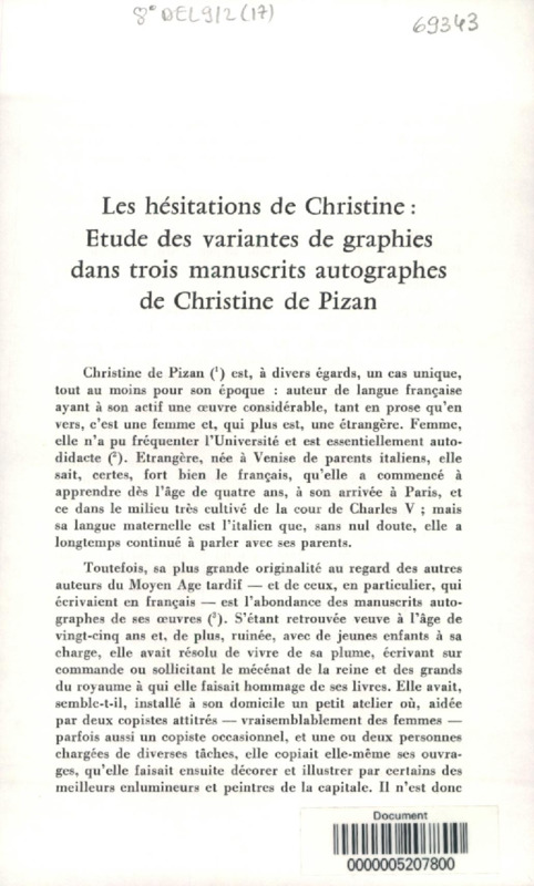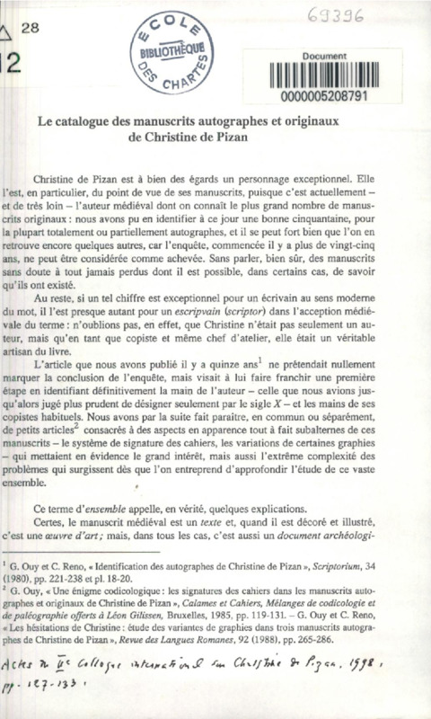 Le catalogue des manuscrits nautographes et originaux de Christine de pizan