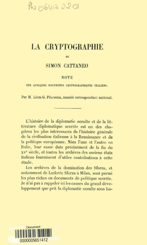 La Cryptographie de Simon Cattaneo, note sur quelques documents cryptographiques italiens
