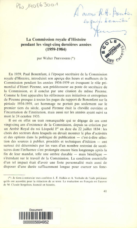 La Commission royale d'Histoire pendant les vingt-cinq dernières années, 1959-1984