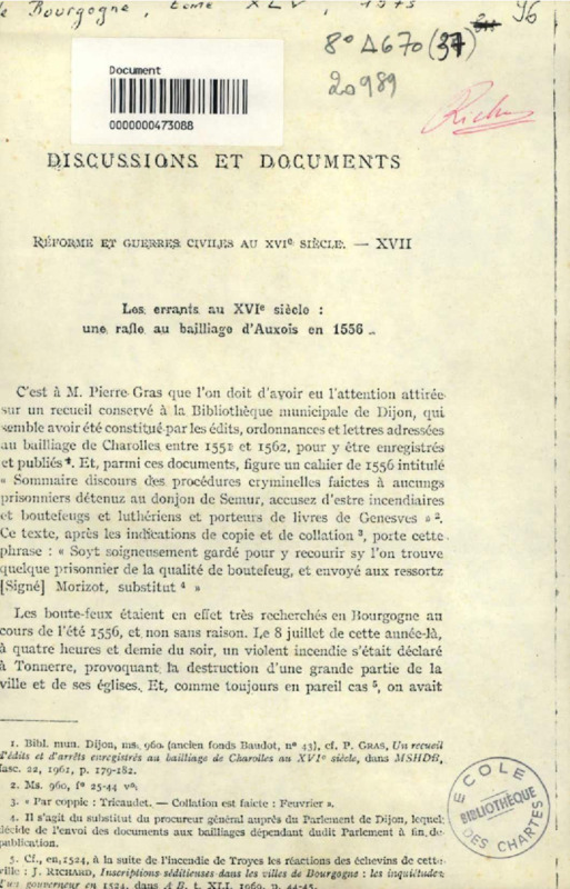 Réforme et guerres civiles au XVIe siècle : les errants au XVIe siècle une rafle au bailliage d'Auxois en 1556