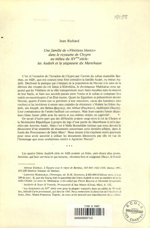 Une famille de "Vénitiens blancs" dans le royaume de Chypre au milieu du XVe siècle : les Audeth et la seigneurie du Marethasse