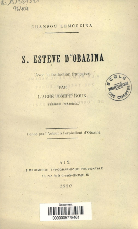 Chansou Lemouzina : S.ESteve d'Obazina, avec la traduction française