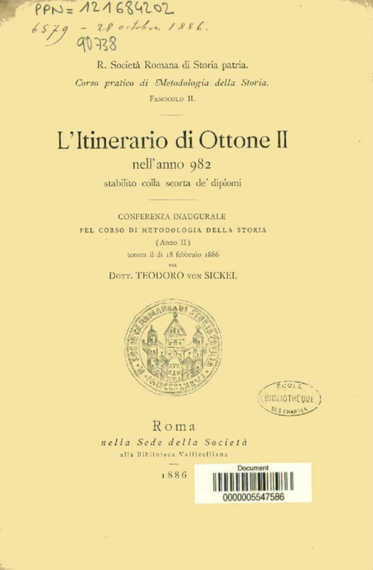L'itinerario di Ottone II nell'anno 982 stabilito colla scorta de' diplomi : conferenza inaugurale pel corso di metodologia della storia (anno II) tenuta il di 18 febbraio 1886