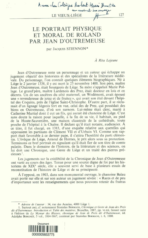 Le portrait physique et moral de Roland par Jean d'Outremeuse