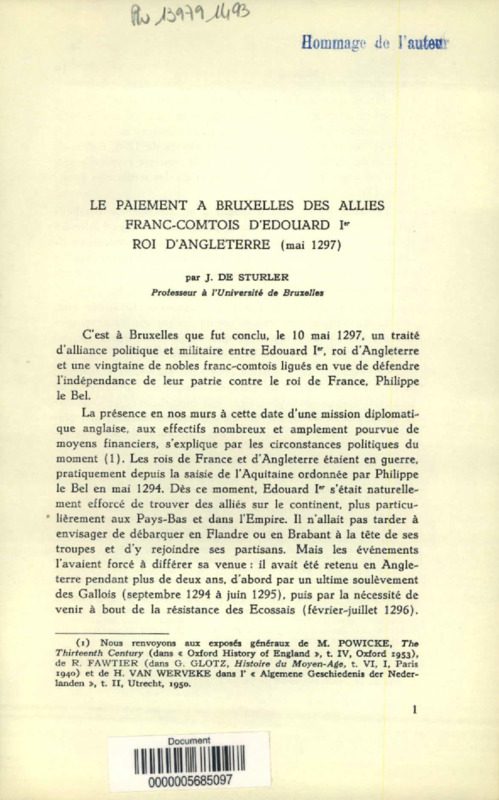 Le paiement à Bruxelles des Alliés franc-comtois d'Edouard Ier, roi d'Angleterre, mai 1297