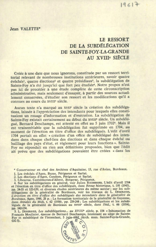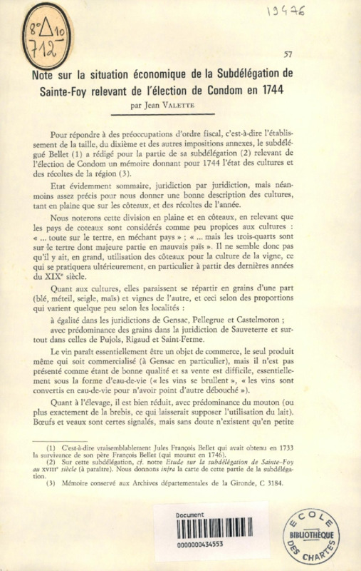 Note sur la situation économique de la subdélégation de Sainte-Foy relevant de l'élection de Condom en 1744