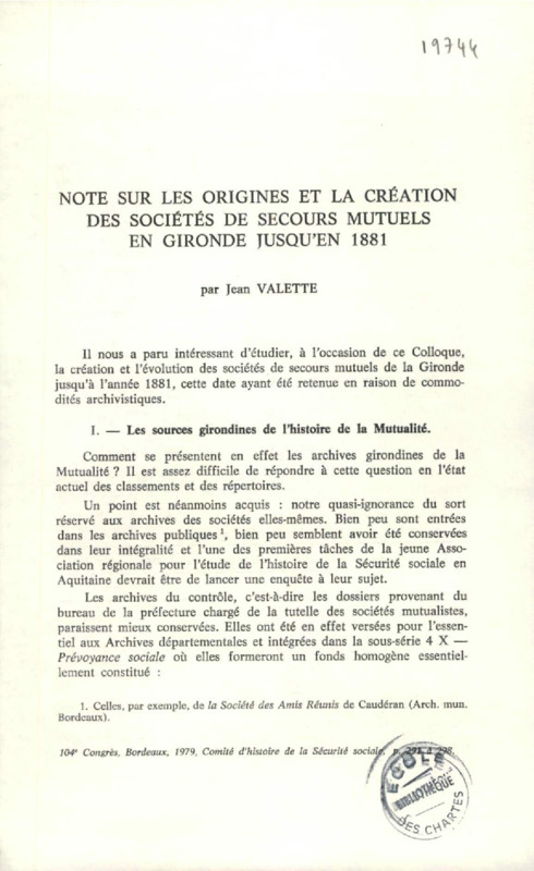 Note sur les origines et la création des sociétés de secours mutuels en Gironde jusqu'en 1881