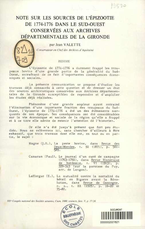 Notes sur les sources de l'épizootie de 1774-1776 dans le Sud-ouest conservées aux archives départementales de la Gironde