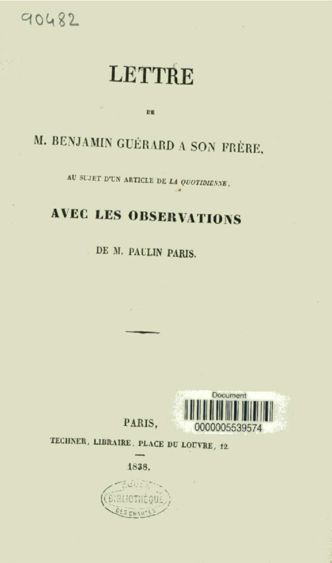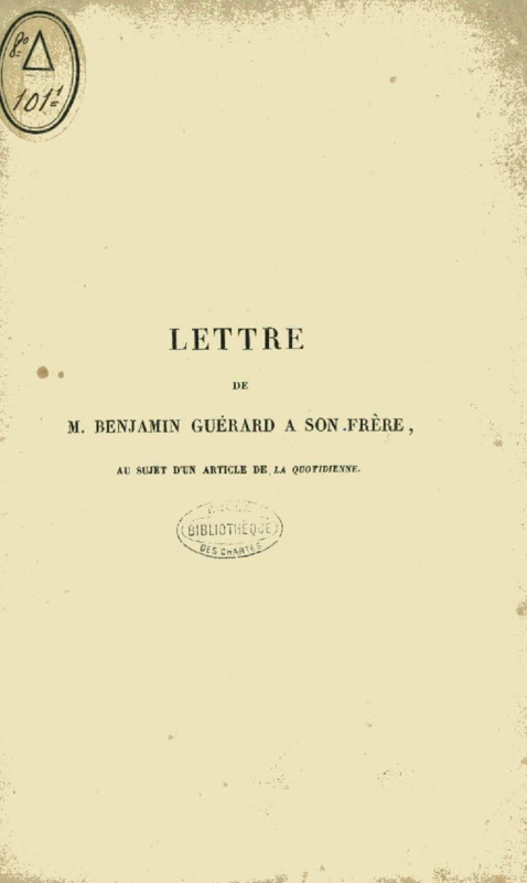 Lettre de M. Benjamin Guérard à son frère, au sujet d'un article de "la Quotidienne", avec les observations de M. Paulin Paris