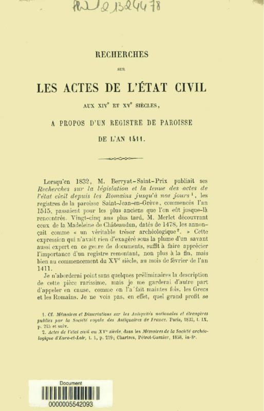 Recherches sur les actes de l'état civil aux XIVe et XVe siècles, à propos d'un registre de paroisse de l'a 1411