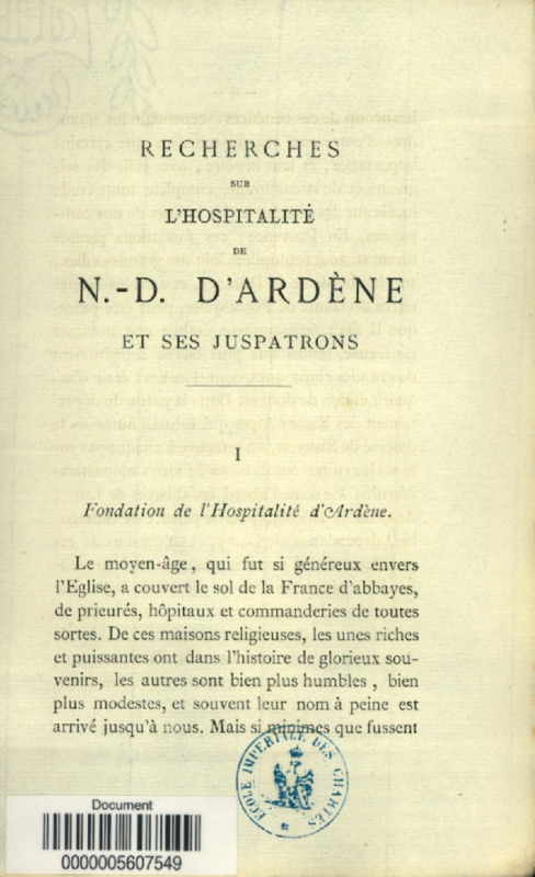 Recherches sur l'hospitalité de N.-D. d'Ardène et ses juspatrons