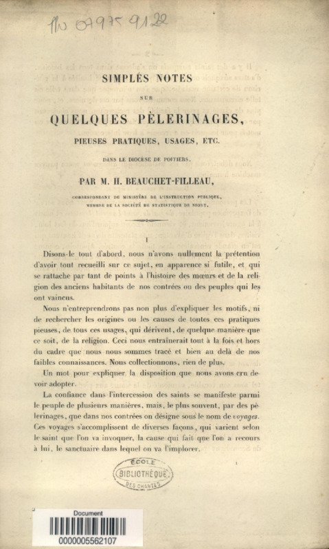 Simples notes sur quelques pèlerinages, pieuses pratiques, usages, etc., dans le diocèse de Poitiers