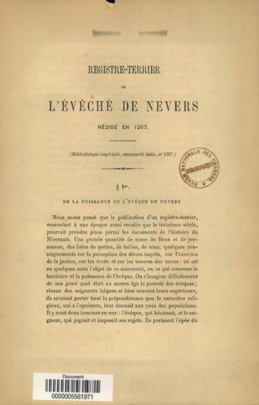 Registre-terrier de l'évêché de Nevers, rédigé en 1287, contenant ls revenus des quatre châteaux de l'évêque, la liste des paroisses, les rôles des tailles, cens, coutumes et autres redevances