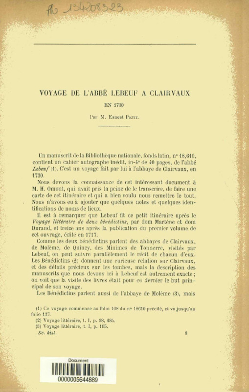 Voyage de l'abbé Lebeuf à Clairvaux en 1730