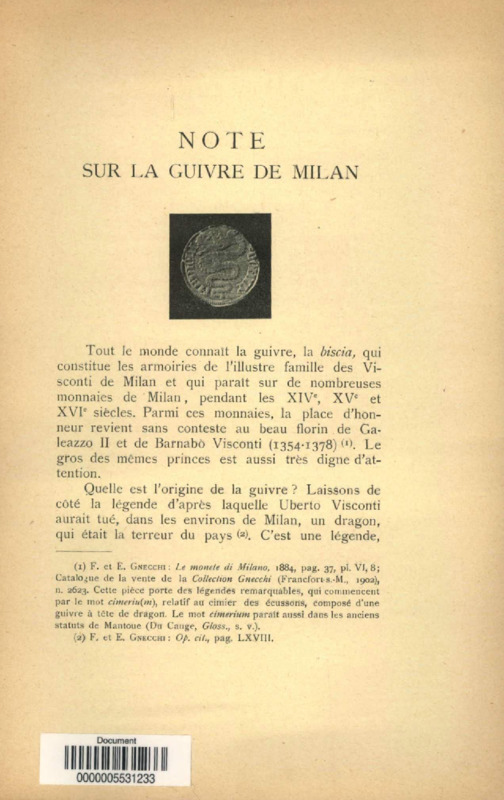 Note sur la guivre de Milan