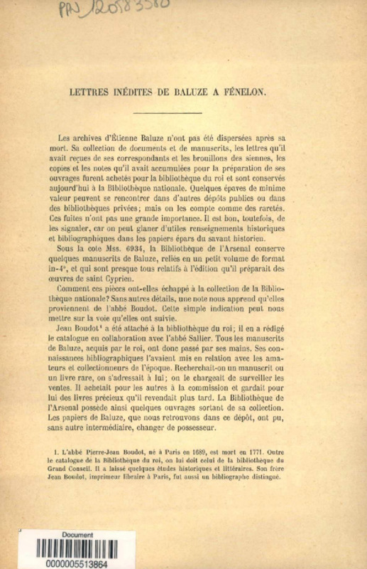 Lettres inédites de Baluze à Fénelon