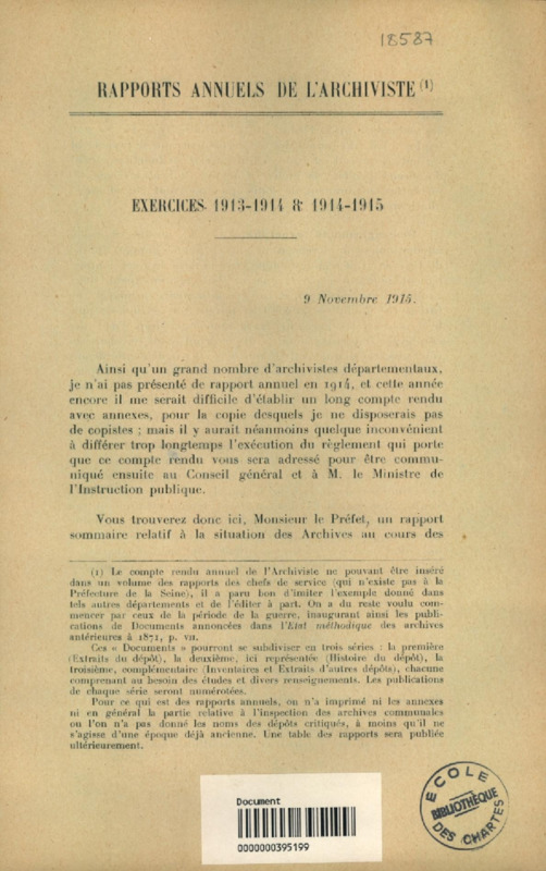 Rapports annuels de l'archiviste de 1914 à 1919