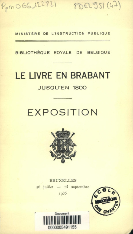 Le Livre en Brabant jusqu'en 1800 : exposition, Bruxelles, Bibliothèque royale de Belgique, 26 juillet-15 septembre 1935