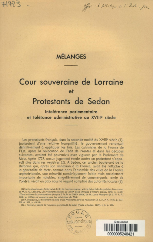 Cour souveraine de Lorraine et protestants de Sedan : intolérance parlementaire et tolérance administrative au XVIIIe siécle