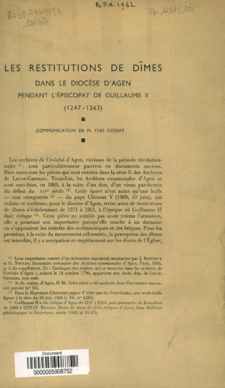 Les Restitutions de dîmes dans le diocèse d'Agen pendant l'épiscopat de Guillaume II, 1247-1263