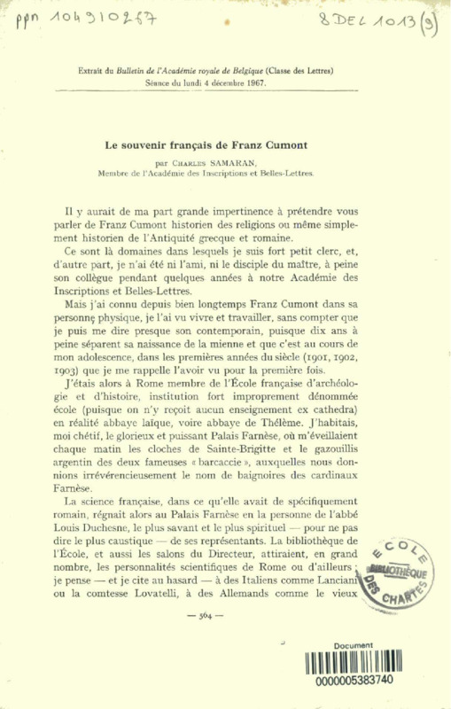 Le souvenir français de Franz Cumont