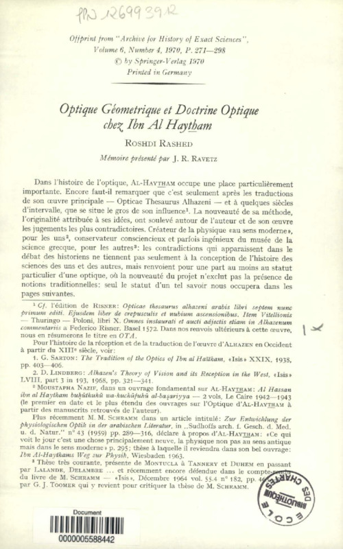 Optique Géométrique et Doctrine Optique chez Ibn Al Haytham