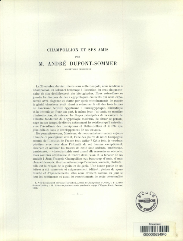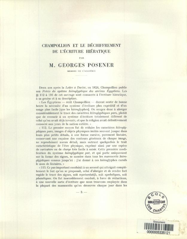 Champollion et le déchiffrement de l'écriture hiératique : discours pour la cérémonie du 20 octobre 1972 en l'honneur de Champollion