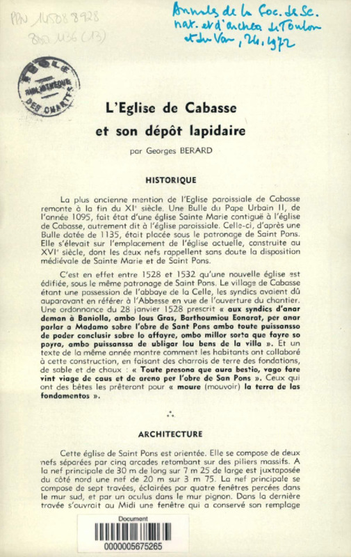 L'église de Cabasse et son dépôt lapidaire