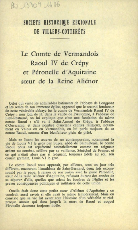 Le comte de Vermandois, Raoul IV de Crépy et Peronnelle d'Aquitaine, soeur de la reine Aliénor