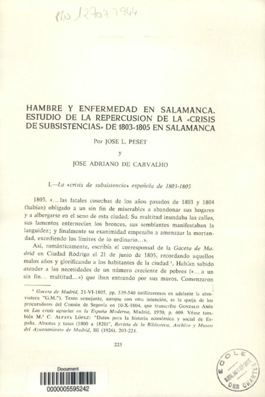 Hambre y enfermedad en Salamanca : Estudio de la repercusion de la "crisis de subsistencias" de 1803-1805 en Salamanca