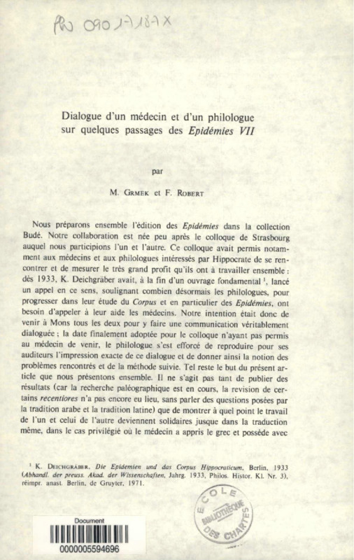 Dialogue d'un médecin et d'un philologue sur quelques passages des "Epidemies VII"