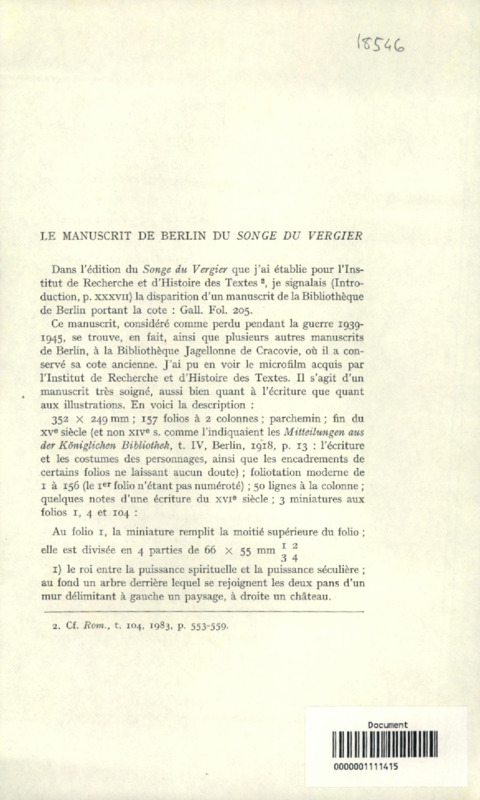 Le manuscrit de Berlin du "songe du vergier"
