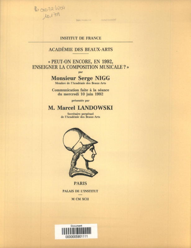 "Peut-on encore, en 1992, enseigner la composition musicale ?" : communication faite à la séance du mercredi 10 juin 1992, Institut de France, Académie des beaux-arts